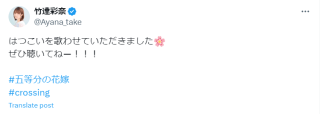 「楽しみ過ぎて夜も眠れません!」“五等分の花嫁”主題歌を 竹達彩奈がカバー決定! | 話題の投稿