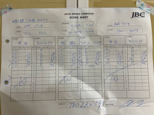 試合のスコアシート。5ラウンドまでほぼ中谷がとっている