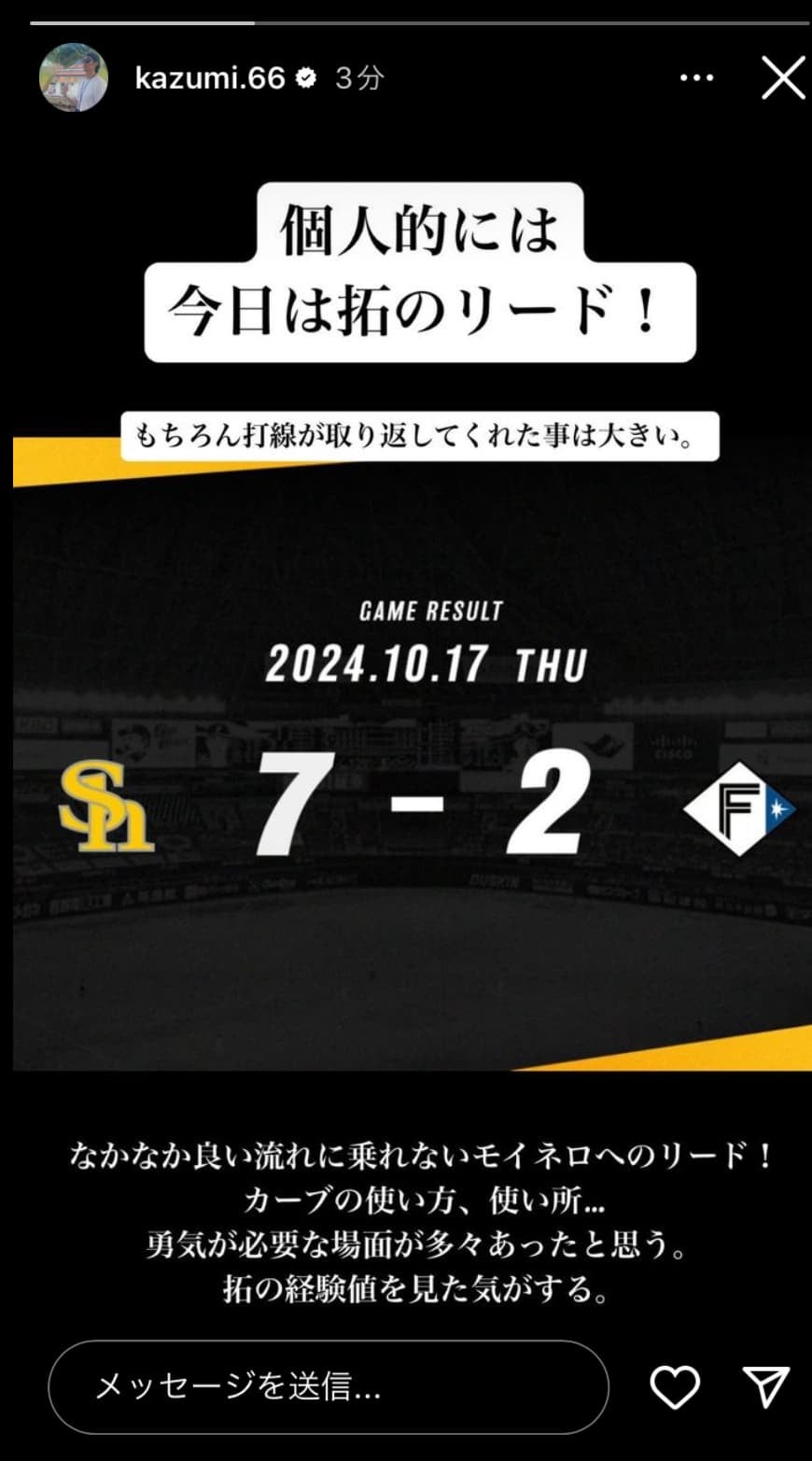 ソフトバンクの斉藤和巳4軍監督が17日、自身のインスタグラム・ストーリーを更新した。