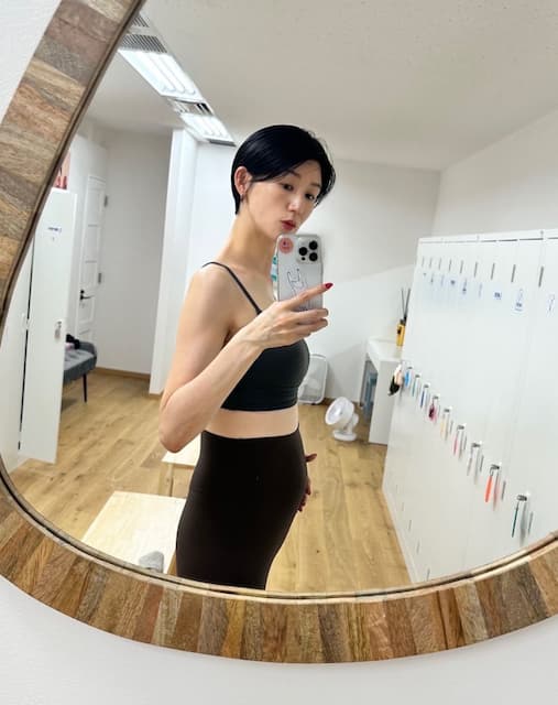 栗原恵 マタニティピラティスウェアで鏡越しショット | 話題の投稿