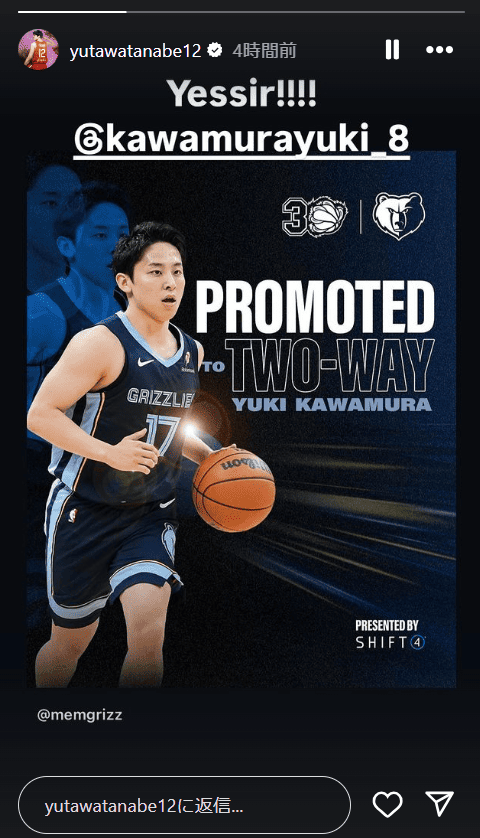 渡邊雄太(@yutawatanabe12)ストーリーより