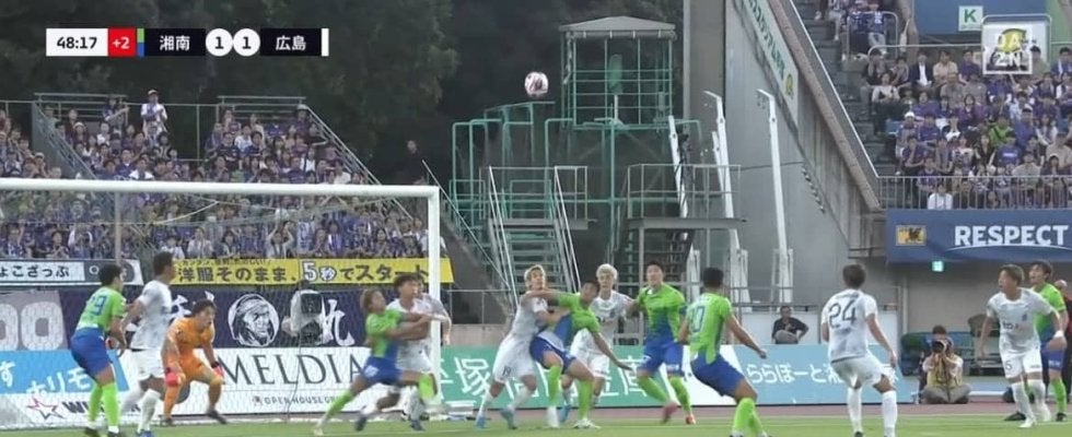 注目のシーンは広島が1点リードで迎えた前半終了間際だ。湘南のCKを広島の守備陣は弾き切れず、FW福田翔生のバイシクルキックからDFキム・ミンテのシュートが決まり同点に追いつかれた。と、思われたが、ゴール直後、広島の佐々木が頭を押さえて倒れ込んだ。