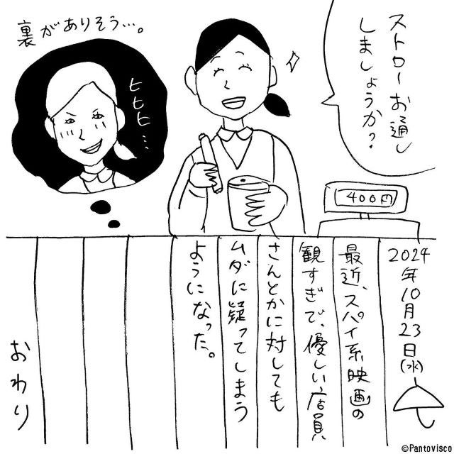 「「映画の見過ぎ」【小コラム】街を歩いてる人も、バス停で待つおばあちゃんも元CIAな気がしてきました。」と綴り、1枚のイラストをアップした。