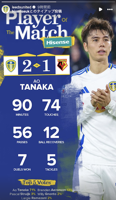 リーズ所属の日本代表MF田中碧はワトフォード戦にダブルボランチの一角としてフル出場し、勝利に貢献。