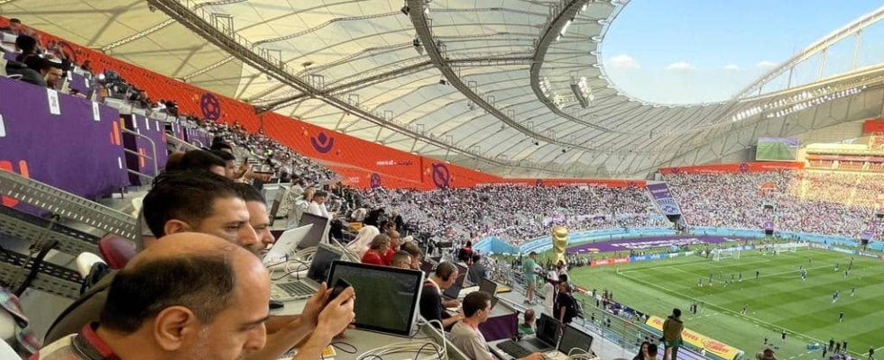 試合を見渡す最高の場所に広々とした机。3席に1台の割合でテレビモニターが置かれ、一般席の6人分のスペースを使う現代の記者席は、「過剰」気味かもしれない。2022年ワールドカップ・カタール大会、ハリーファ国際スタジアム。🄫Y.Osumi
