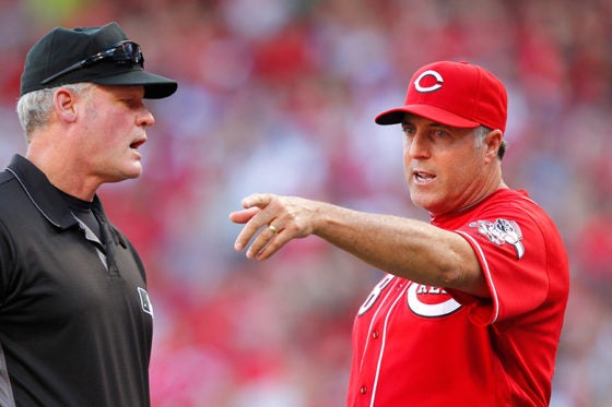 きっかけは選手の退場処分だった。5-5の同点で迎えた7回表、2死一塁で打席に立ったレッズのジェネットは、カウント2-2から外角いっぱいの速球を自信を持って見送った。だが、球審の判定は見逃し三振。この判定を不満に思ったジェネットは、球審に背中を向けたまま、バットを投げ捨て、ヘルメットを叩きつけると、自打球よけのシンガードを放り投げた。すると、球審はすかさず退場を宣告。ここでベンチを飛び出したのが、レッズのプライス監督だ。
