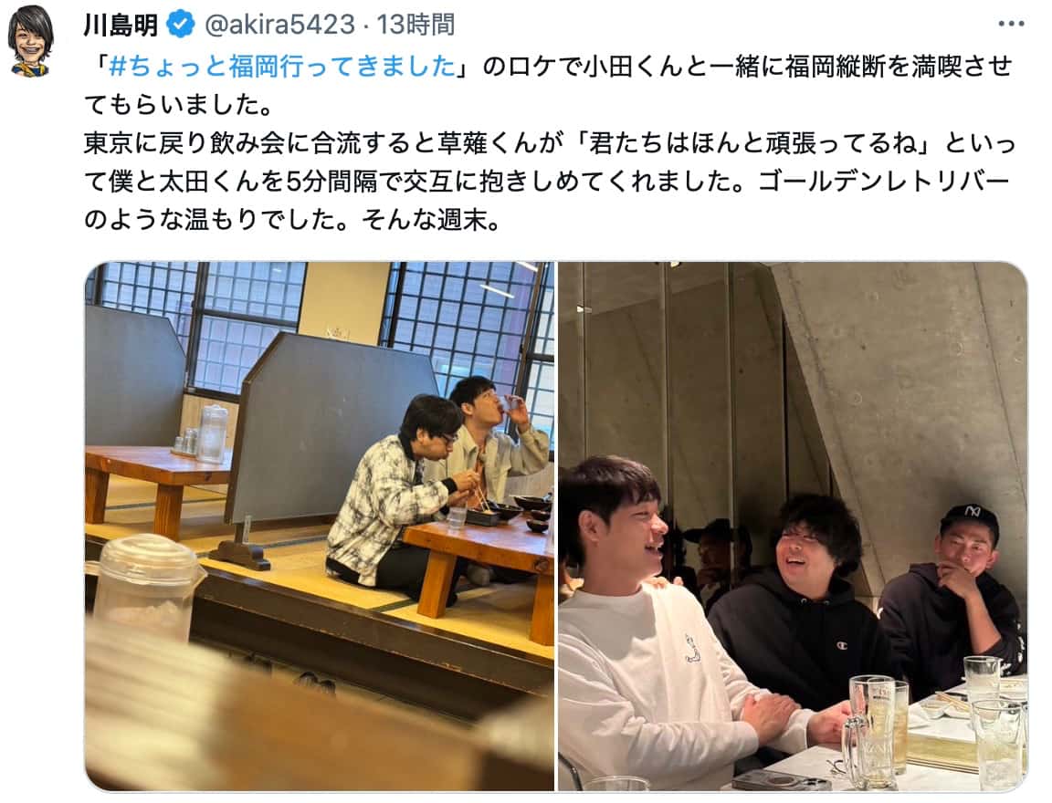 11月3日、川島明が公式Xで福岡ロケと草薙との交流を投稿。【画像】「2人で本気食いしてました!」麒麟 川島がミツカンCM…