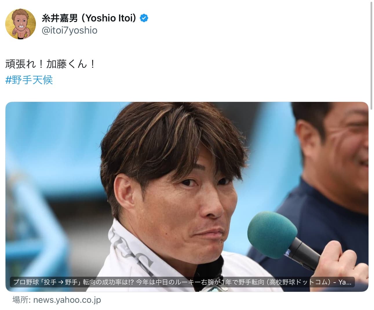 糸井嘉男「頑張れ!加藤くん!」野手転向のルーキーを応援 | 話題の投稿