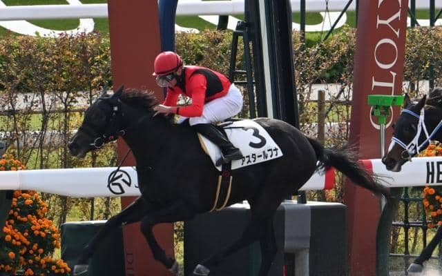 10日、京都競馬場4Rで行われた新馬戦(2歳・牝・ダ1400m・14頭)は、道中はハナに立って、直線で一旦は前に出られるも差し返した岩田望来騎手騎乗の3番人気アスタールフナ(牝2、栗東・中竹和也厩舎)が、2番手追走から争った2番人気バシリス(牝2、栗東・寺島良厩舎)に1馬身差をつけ優勝した。勝ちタイムは1分25秒5(良)。