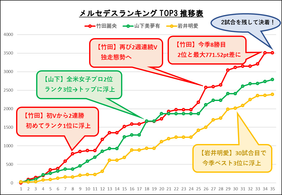山下の“天下”は1カ月余りで終わりを告げる。竹田が8月上旬「北海道meijiカップ」を制す今季4勝目でトップを奪還。以降、女王決定まで1度もその座を譲ることはなかった。