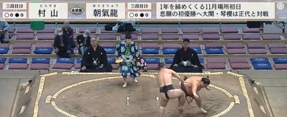 三段目十九枚目・村山(鳴戸)と三段目十九枚目・朝氣龍(高砂)の取組では敗れた朝氣龍が勢いよく土俵下へと落下……館内からは悲鳴が上がり、ネットには「とっ、飛んだ!」などの反響が寄せられたが、朝氣龍の身のこなしを受け、一転「身体能力すごい」など称賛の声が集まった。