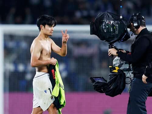 バルセロナ戦後、カメラに向かってVサインをする久保建英