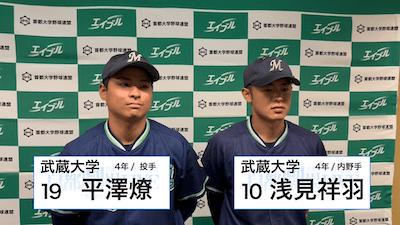 【第一試合】武蔵大学 6-3 桜美林大学ヒーロー : 武蔵大学4年 平澤燎(投手)背番号194年 浅見祥羽(内野手)背番…