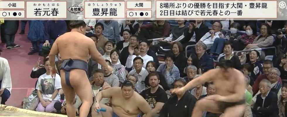 立ち合い突き上げるようにもろ手で当たった豊昇龍は、素早く若元春の腕をたぐって振り回すと、そのまま土俵際で右手一本で強烈に押し出した。敗れた若元春は勢い余って土俵下へと大きく転がり落ちていった。あまりに豪快な勝利に館内騒然。豊昇龍も「んっ?」と気にするように土俵下へと目をやると、悔しそうに顔をしかめた若元春に手を差し伸べようとする気づかいも見せていた。勝った豊昇龍は2勝目。敗れた若元春は1敗目を喫した。