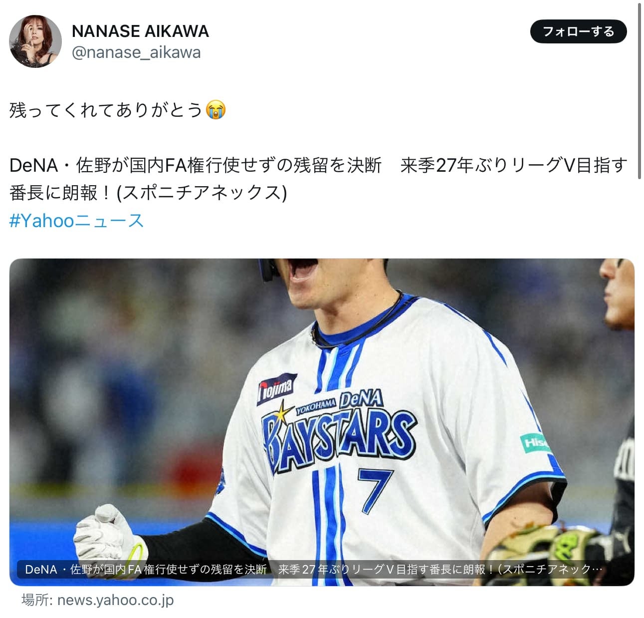 相川七瀬「残ってくれてありがとう」DeNA佐野残留!!FA権行使せず | 話題の投稿