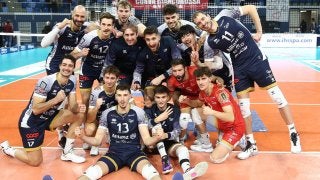 チームメートと勝利を喜ぶ大塚達宣【Photo:Lega Pallavolo Serie A】(adsbygoogle=w…