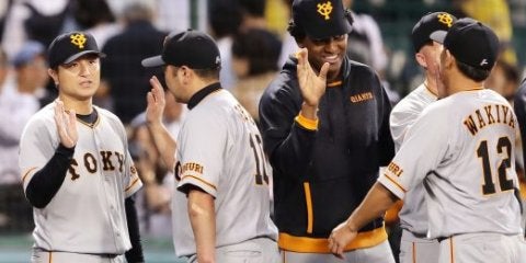 阪神と引き分け、ナインを迎える巨人・高橋監督(左端)=甲子園【写真提供:共同通信社】甲子園で行われた阪神対読売巨人の一戦…