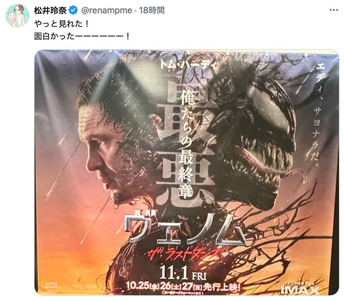 松井玲奈、『ヴェノム』最新作を鑑賞 「面白かった!」と感想を投稿 | 話題の投稿