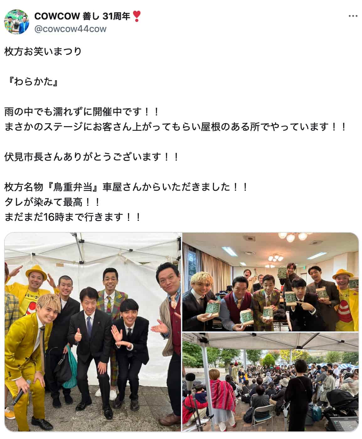お笑いコンビ・COWCOWの善しが公式Xで「枚方お笑いまつり『わらかた』」の開催状況を報告。雨の中でも観客を屋根付きステ…