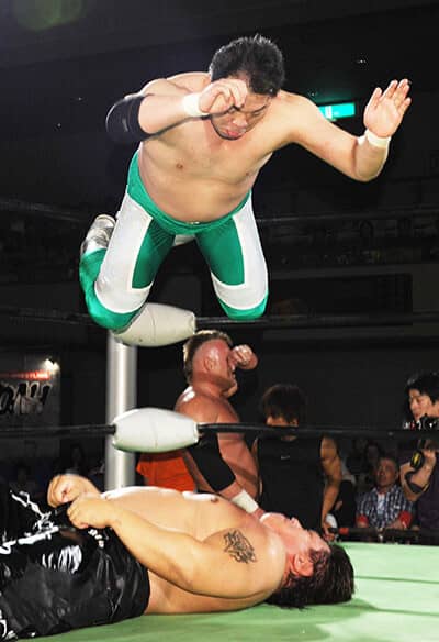 2009年6月13日、三沢光晴(上)の技を受ける齋藤彰俊。これが三沢のラストマッチになった
