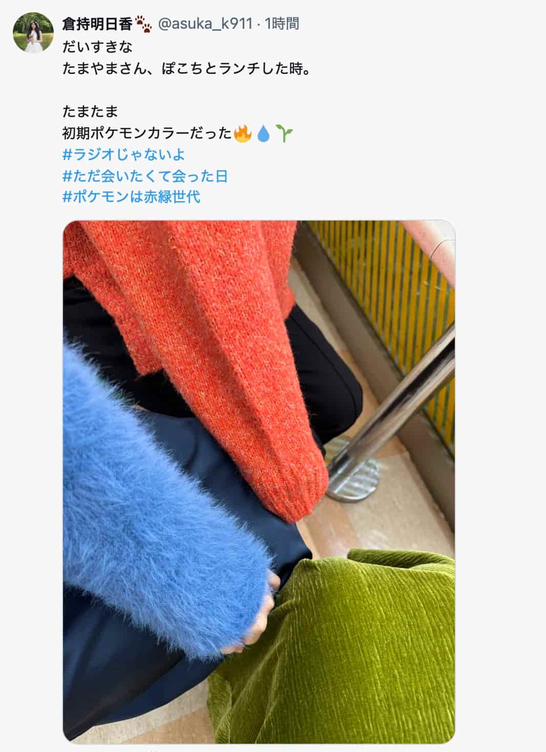 倉持明日香、松井咲子&北原里英とランチ 「たまたま初期ポケモンカラーだった🔥💧🌱」 | 話題の投稿