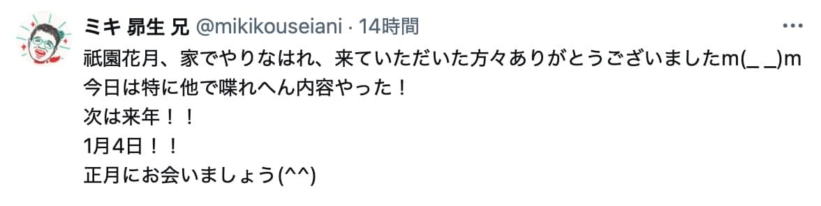お笑いコンビ・ミキの昴生が公式Xで祇園花月「家でやりなはれ」公演への感謝を投稿。特別な内容のトークを披露し、次回公演は1…
