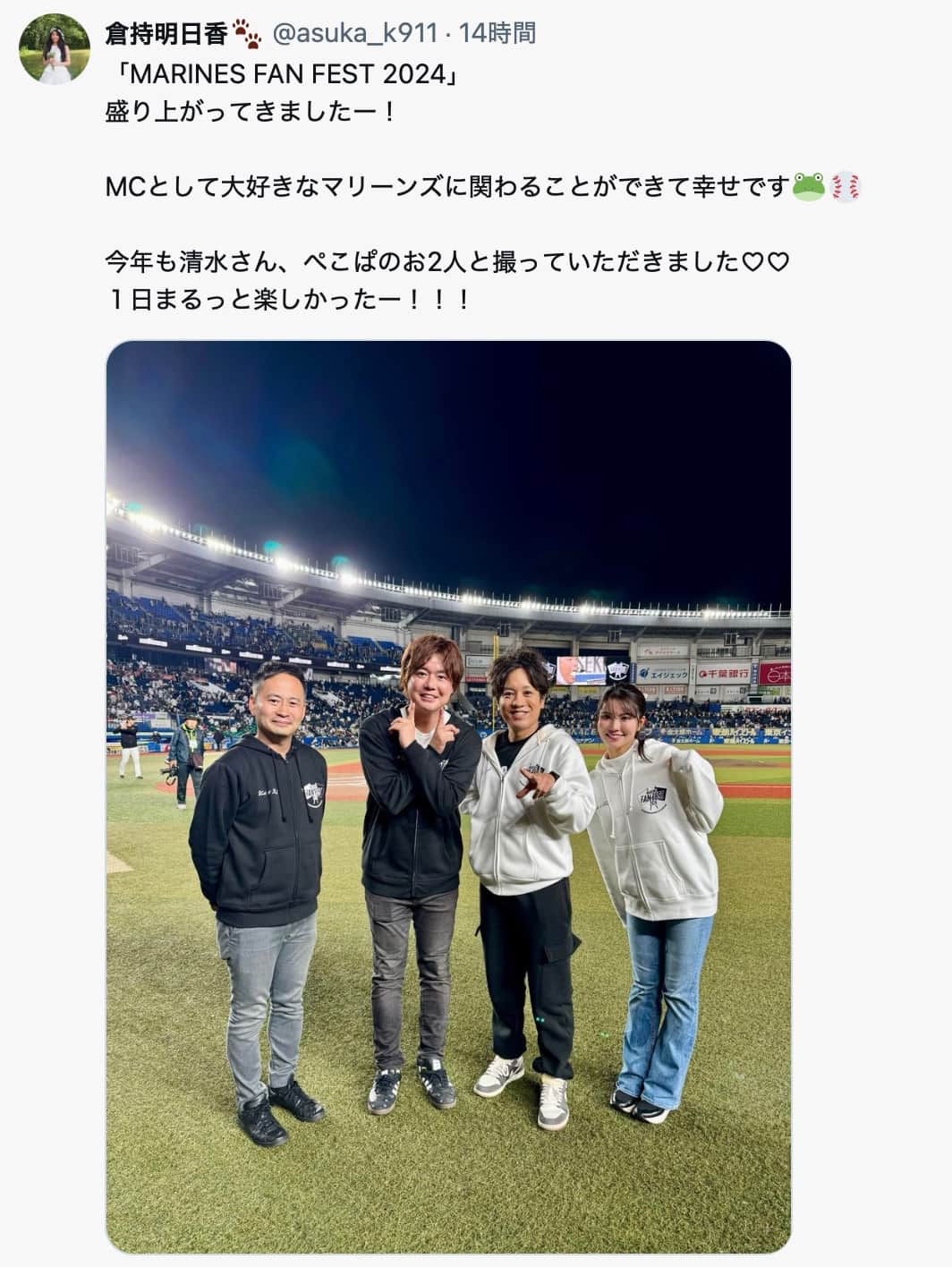 倉持明日香、「MARINES FAN FEST 2024」でMC担当!笑顔あふれる1日に感謝 | 話題の投稿