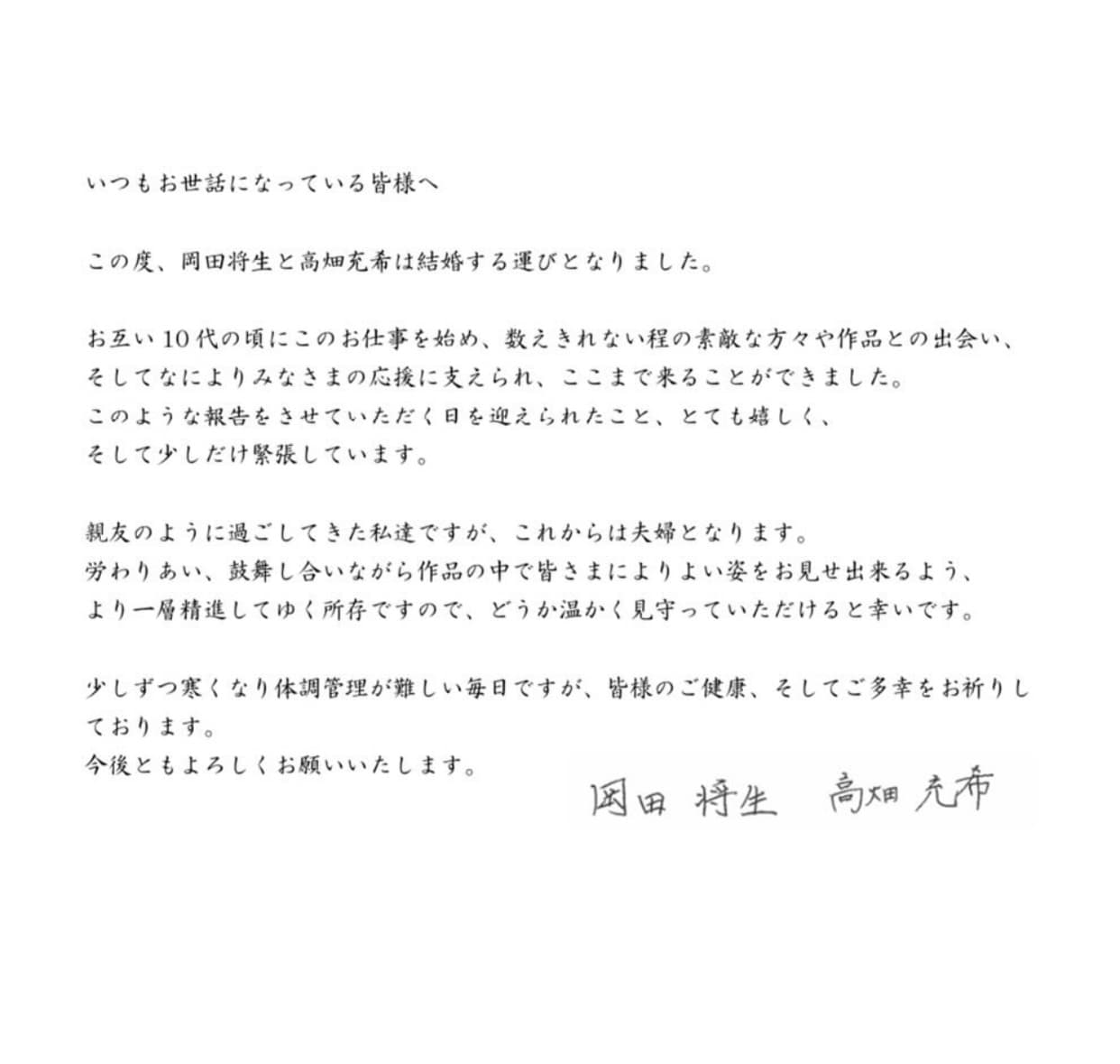 「この度、岡田将生と高畑充希は結婚する運びとなりました。」と結婚を報告。