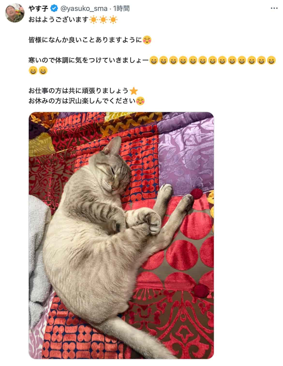 やす子、朝の挨拶と猫の癒しショットを投稿!「体調に気をつけていきましょー」 | 話題の投稿