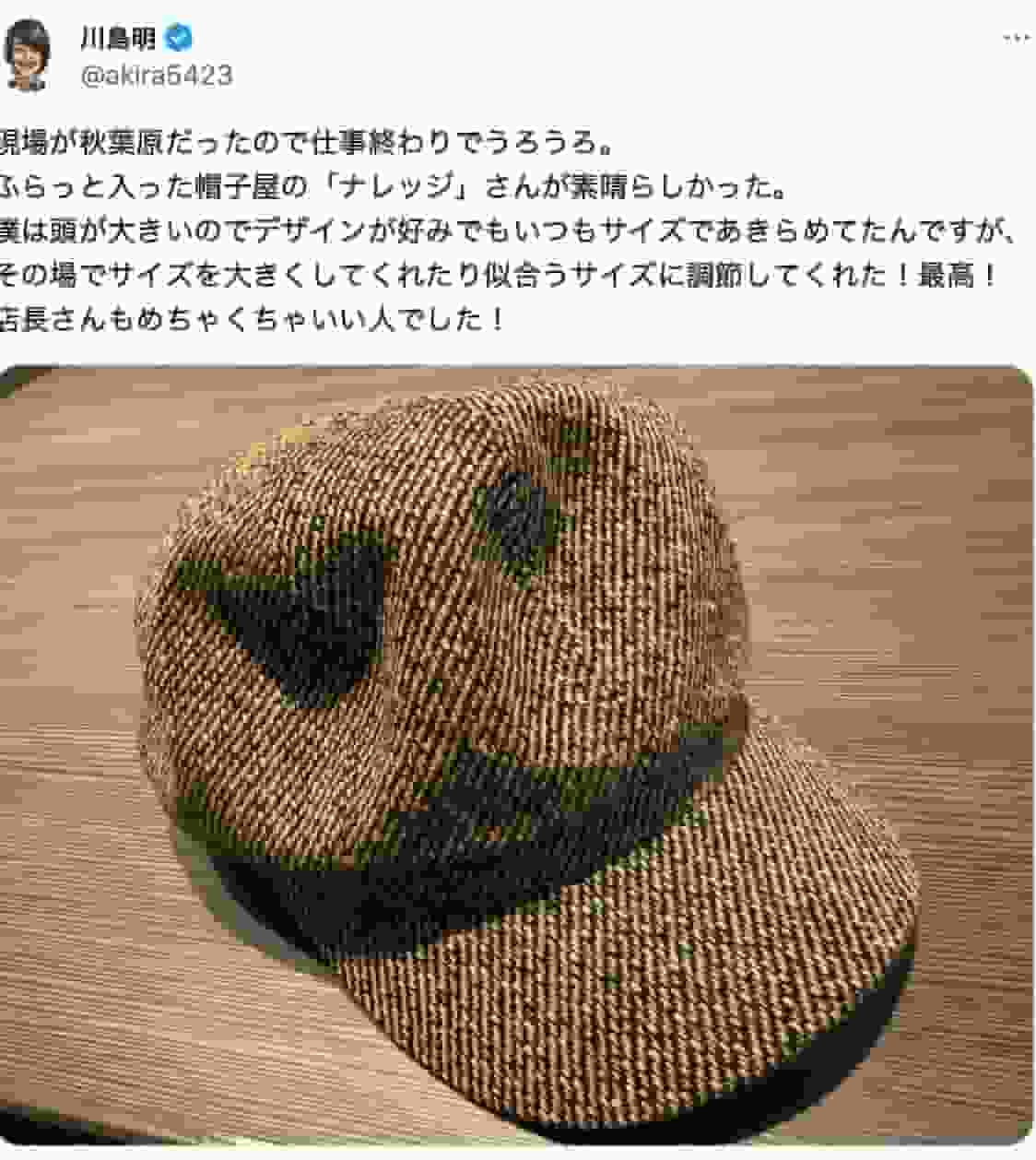 麒麟・川島、秋葉原で見つけた神対応の帽子屋「ナレッジ」に感動!サイズ調整に感謝 | 話題の投稿
