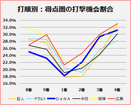 上の表は走者が得点圏にいる状況で8番打者が打席に立った割合を示したものだ。実は、DeNAはチームの平均的な得点圏での打席割合との差が広島に次いで2番目に低い値となっており、純粋に8番打者が得点圏で打撃をする割合25.1%は、リーグで最も低い値となっている。DeNAは8番打者にチャンスで回りにくいチームなのだ。