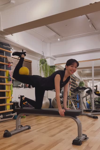 「Workout💪🏻本日もボールを使って🟡ベンチの上でもボールを操ってきました😊笑二の腕もお尻にも効きます〜💦」とトレーニングの様子を動画で公開。