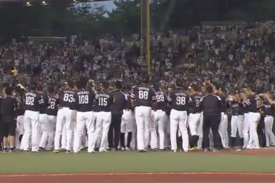 優勝が決まり輪になって祝福するソフトバンクの選手・コーチたち【画像:(C)PLM】