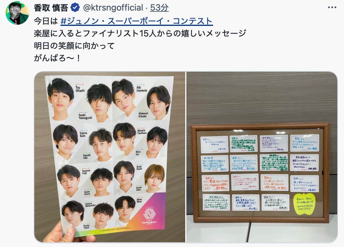 香取慎吾が公式Xで「ジュノン・スーパーボーイ・コンテスト」ファイナリスト15人からのメッセージに感謝の投稿。最終選考会へ…