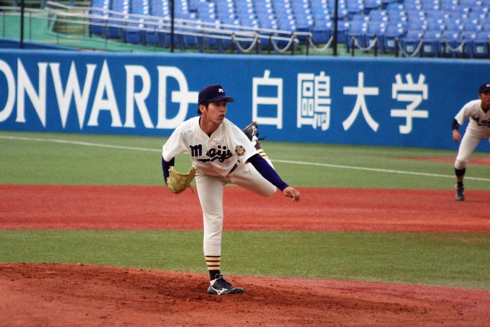 その後、台風接近で冷たい雨が降り始めた中、4回、5回と両先発が意地を見せてスコアは動かず。だが明大が6回、2死2塁から2番・添田がこの日自身3本目の安打&2本目のタイムリーを放って貴重な追加点を奪うと、続く7回には無死1塁から越智達矢(3年・丹原)のエンドランが決まって超鵜ホームイン。さらに代わった柏野智也(1年・広陵)から高瀬雄大(3年・長崎西)がライトスタンドへ自身リーグ戦初本塁打となる2ラン。リードを5点に広げて試合を決めた。