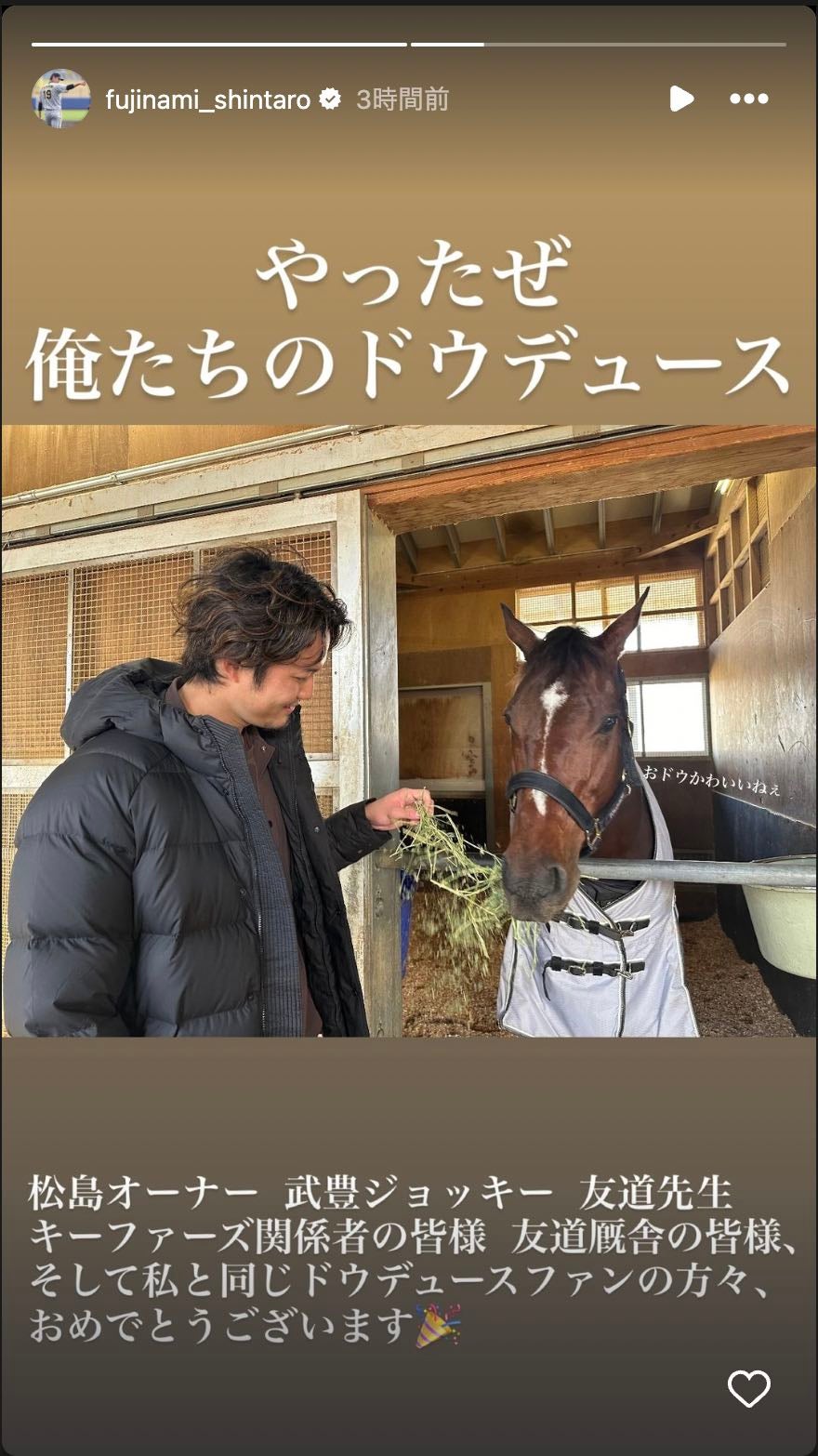 ストーリーにて「やったぜ 俺たちのドウデュース」と綴り、投稿をアップ。
