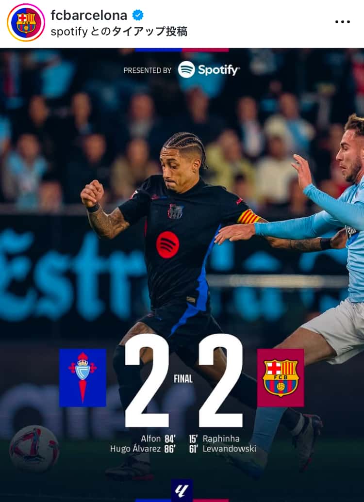 バルセロナ、セルタ戦を2-2で引き分け!公式インスタで試合結果を報告 | 話題の投稿