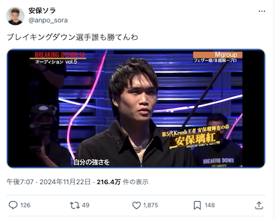 格闘家の安保ソラが22日、自身のSNSを更新した。【画像】那須川天心 タイトル戦から一夜明けファンにメッセージ「ブレイキ…