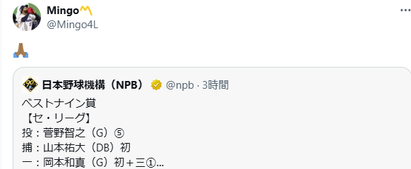 プロ野球セ・パ両リーグのベストナインが25日に発表。ヤクルトのドミンゴ・サンタナが受賞し、自身のXで反応した。【画像】台…