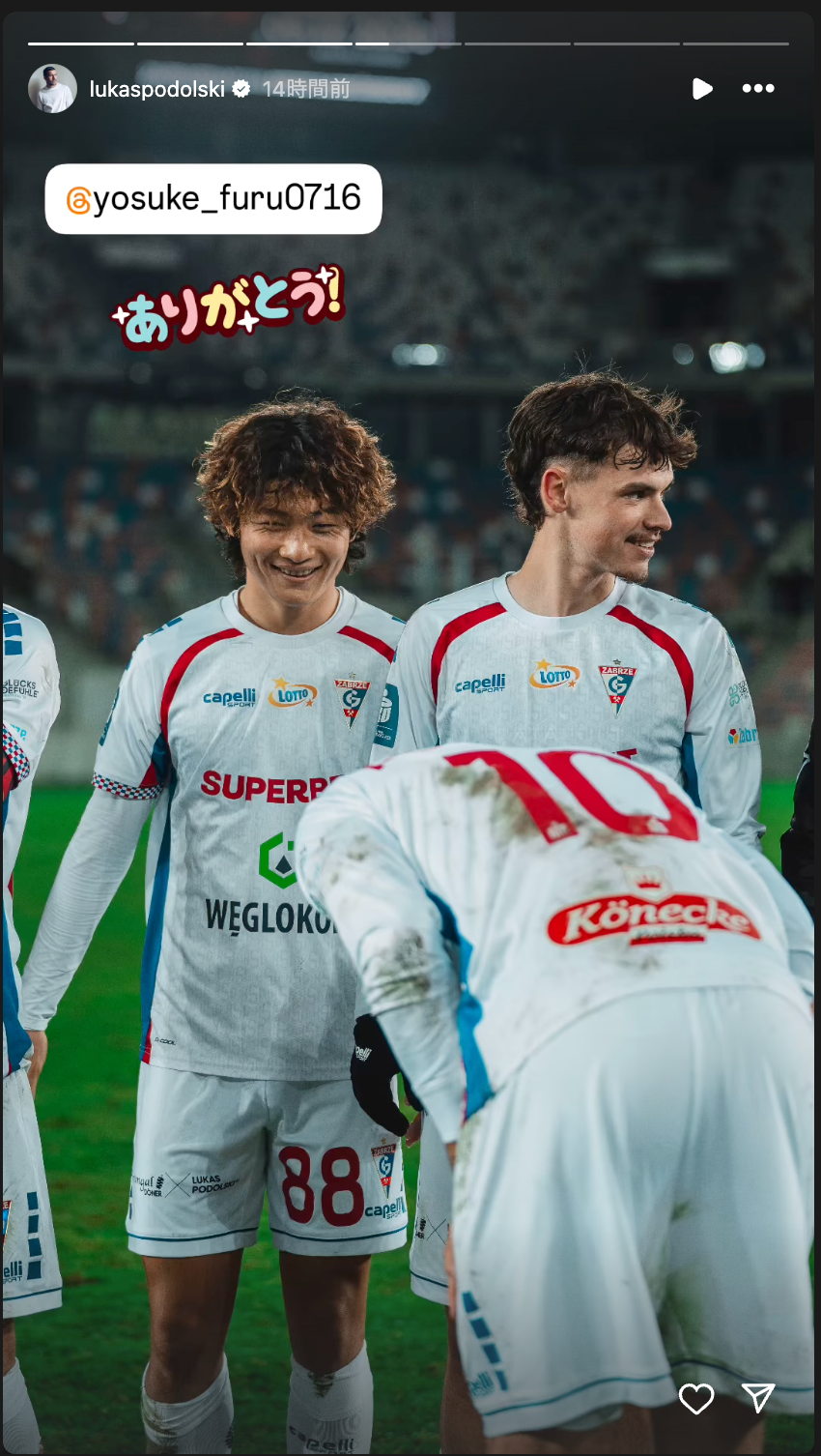 26日、サッカー元ドイツ代表のルーカス・ポドルスキが自身のSNSを更新した。【画像】槙野智章 元同僚の引退に労い「宇賀神…