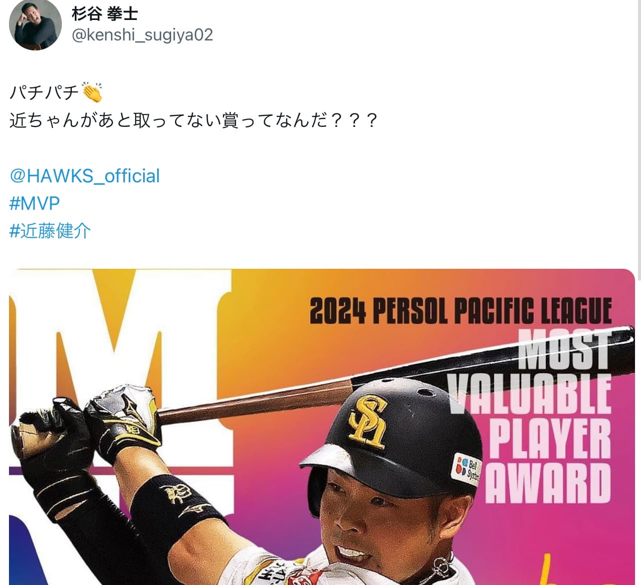 杉谷拳士 元チームメイトの近藤健介を祝福!パリーグMVPを獲得 | 話題の投稿