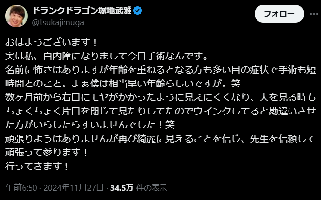俳優としても人気の芸人、白内障を告白…手術に向けた心境を明かす | 話題の投稿