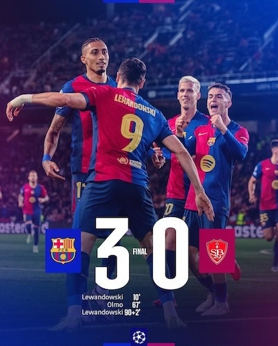 バルセロナが好調ブレストを撃破!レヴァンドフスキのゴールラッシュが止まらない!