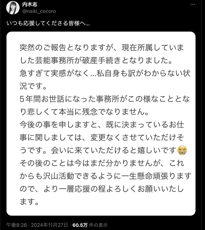 あの女優が所属事務所の破産を報告「いつも応援してくださる皆様へ…」
