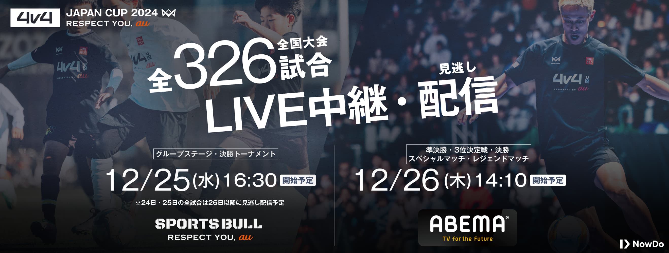 Now Do 株式会社(所在地:東京都新宿区、代表取締役社長:本田圭佑、以下Now Do)が運営する、4人制サッカー全国大会「4v4 JAPAN CUP 2024 RESPECT YOU, au(以下、本大会)」をLIVE中継することをご報告いたします。
