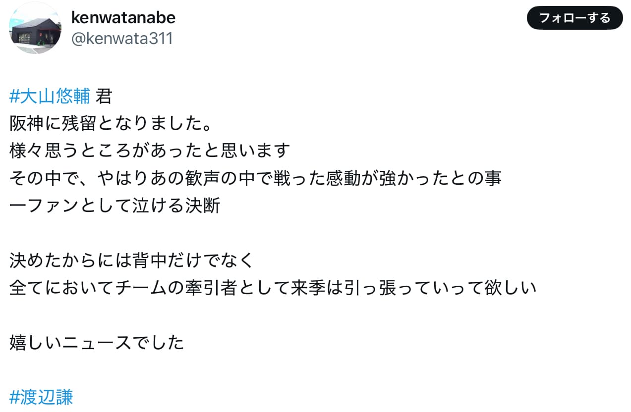 渡辺謙 阪神・大山の残留にコメント | 話題の投稿