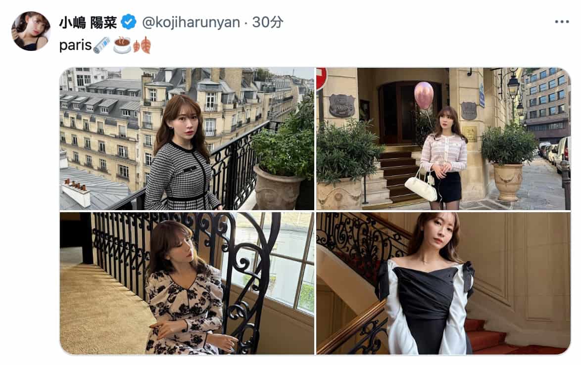 11月30日、小嶋陽菜が公式Xで「paris🗞️☕️🍂」とコメントし、パリの街並みを背景にした自身の写真を投稿。エレガン…