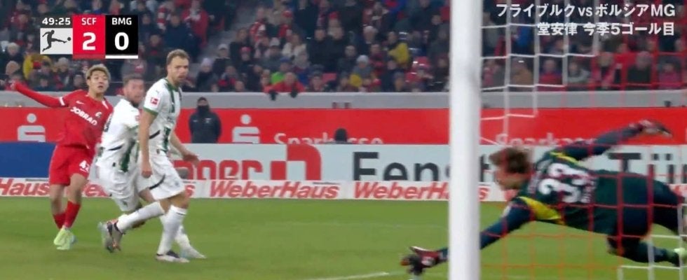 49分にフライブルクの堂安はボックス内の左側で味方選手が放ったシュートのこぼれ球を回収すると、前に2人の選手がいる中で縦に持ち出してから左足を一閃。ゴールまでほぼ角度のない位置から逆サイドのネットに突き刺さる難易度の高いゴラッソを決めてみせた。