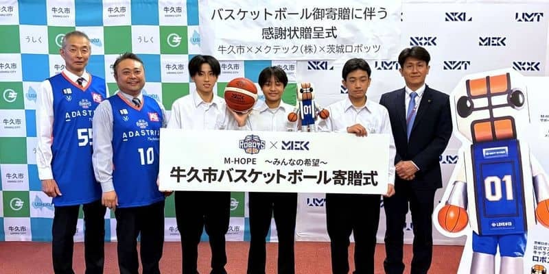 寄贈式には、牛久市長の沼田和利氏、茨城ロボッツの川﨑篤之社長、メクテックCEOの伊藤太郎氏が出席。また、寄贈を受ける牛久市立牛久南中学校のバスケットボール部代表生徒3名も参加しました。