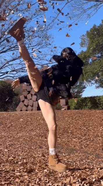 「紅葉の季節にハイキック🍁思ったより落ち葉被ってびっくりしました😂」と綴り、1本の動画をアップした。